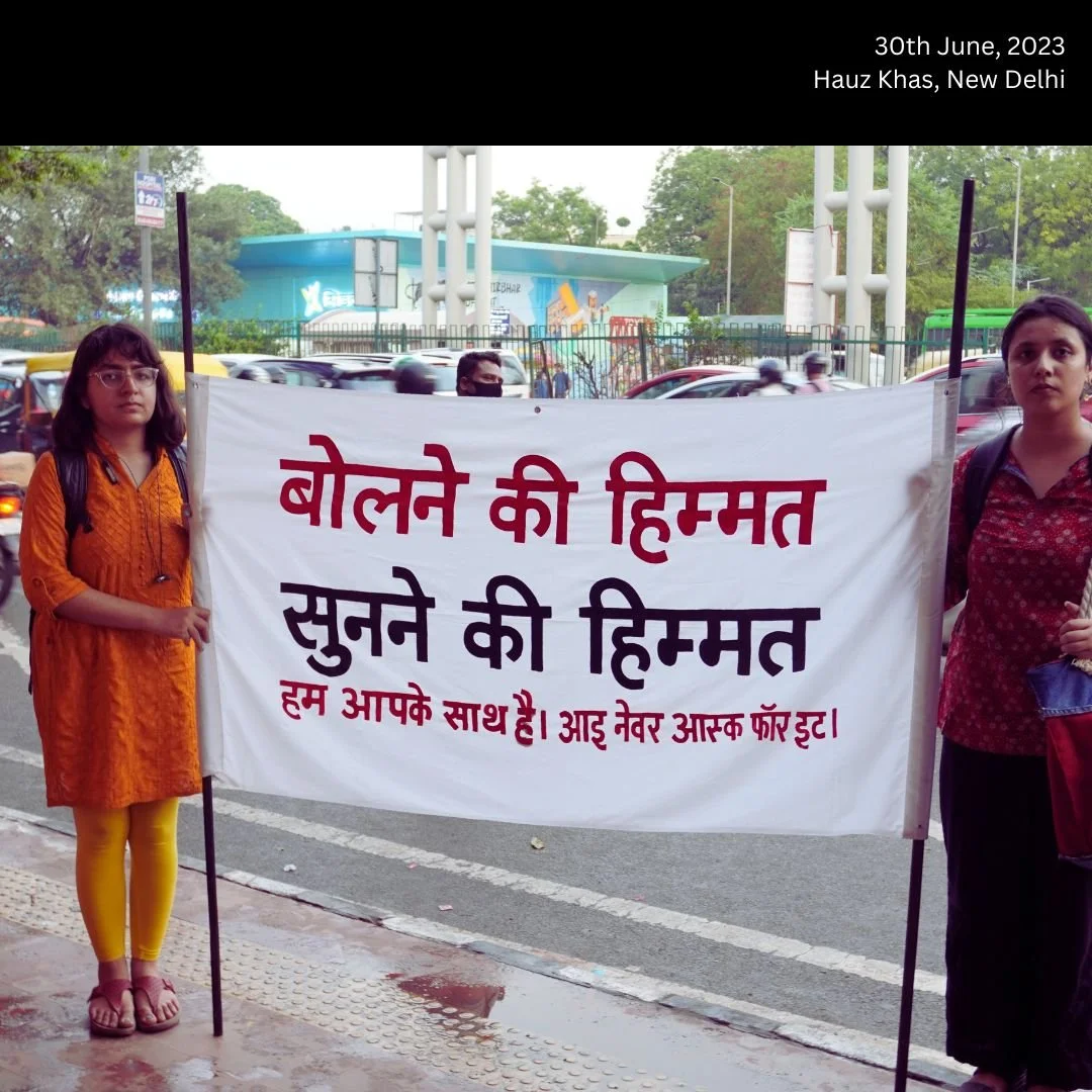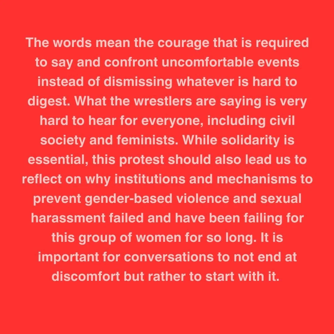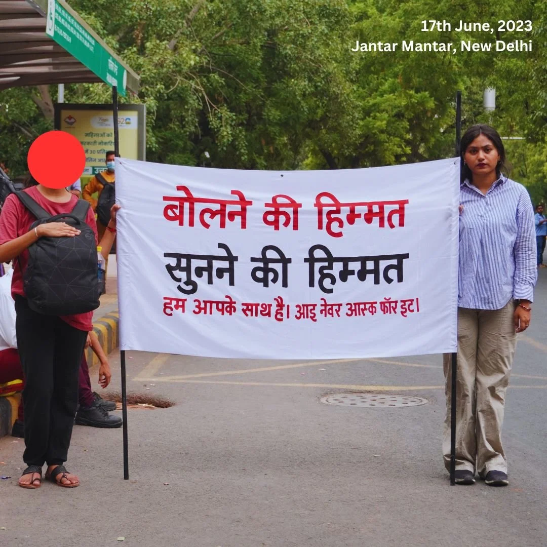 "After witnessing the on-ground events of the Wrestlers' Protest at Jantar Mantar, and how the wrestlers have been treated there was a lot of anger in me, still is. But I don't want that anger to go in vain rather wanted it to become a transformative force. Thus, the urgency in me to register my solidarity in an means possible. Holding the banner was one way to do that. I just hope my bit and of the people of rest of the country reaches to the people in power and justice prevails." -